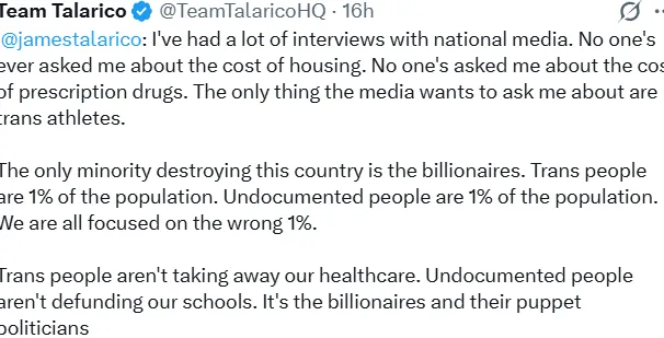 .@jamestalarico: I've had a lot of interviews with national media. No one's ever asked me about the cost of housing. No one's asked me about the cost of prescription drugs. The only thing the media wants to ask me about are trans athletes.